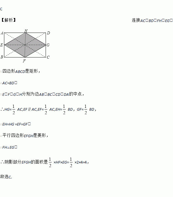 已知:如图,在矩形ABCD中,E ,F ,G ,H分别为边AB, BC ,CD, DA的中点.若AB=2,AD=4,则图中阴影部分的面积为 ( )