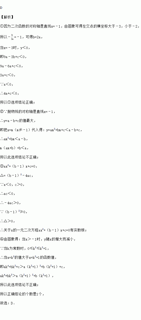 ①4a+c<0;②m(am+b)+b>a(m≠﹣1);③关于x的一元二次方程ax2+(b﹣1)x+c=0没有实数根;④ak4+bk2<a(k2+1)2+b(k2+1)(k为常数).其中正确结论的个数是( )