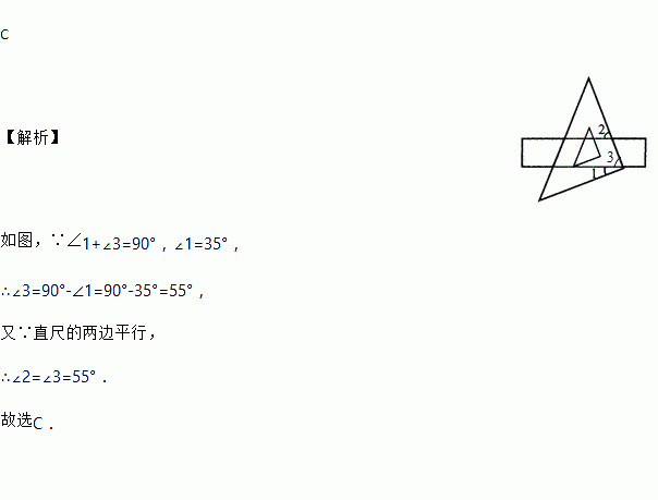 如图把一块直角三角板的直角顶点放在直尺的一边上,若∠1=35°,则∠2等于( )