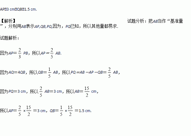 如图,线段AB上有两点P,Q,点P将AB分成两部分,AP=PB,点Q将AB也分成两部分,AQ=4QB,PQ=3 cm,求AP,QB的长.