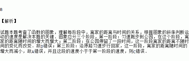 某人匀速跑步到公园,在公园里某处停留了一段时间,再沿原路匀速步行回家,此人离家的距离y与时间x的关系的大致图象是