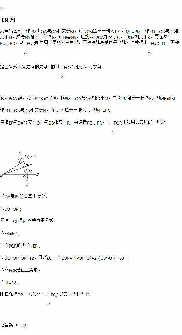 如图,∠AOB=30°,∠AOB内有一定点P,且OP=12,在OA上有一点Q,OB上有一点R,若△PQR周长最小,则最小周长是_____