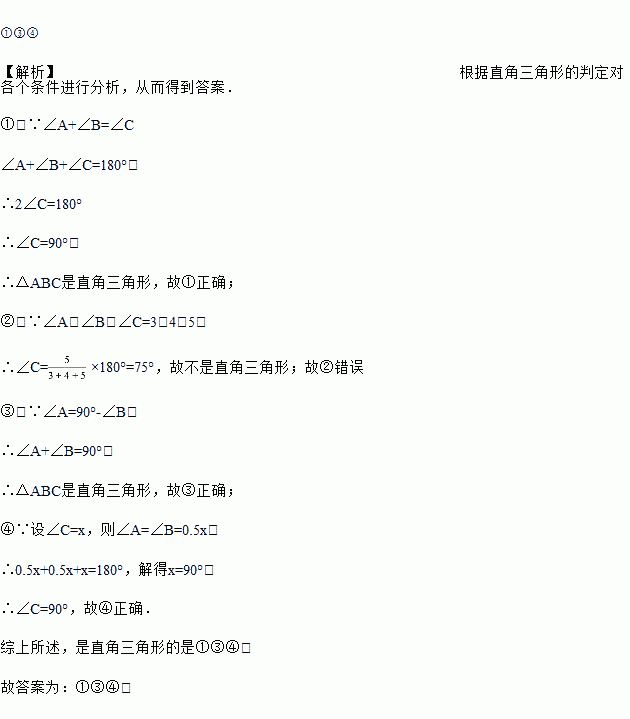 ①∠A+∠B=∠C;②∠A:∠B:∠C=3:4:5,③∠A=90°-∠B ;④∠A=∠B=0.5∠C,