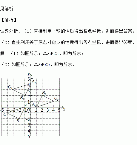 见解析 【解析】 试题分析:(1)直接利用平移的性质得出各点坐标,进而得出答案; (2)直接利用关于原点对称点的性质得出各点坐标,进而得出答案. 【解析】 (1)如图所示:△A1B1C1,即为所求; (2)如图所示:△A2B2C2,即为所求.