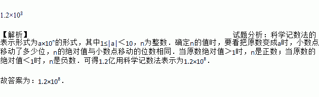 《“一带一路”贸易合作大数据报告(2017)》以“一带一路”贸易合作现状分析和趋势预测为核心,采集调用了8000多个种类,总计1.2亿条全球进出口贸易基础数据…,1.2亿用科学记数法表示为__________.