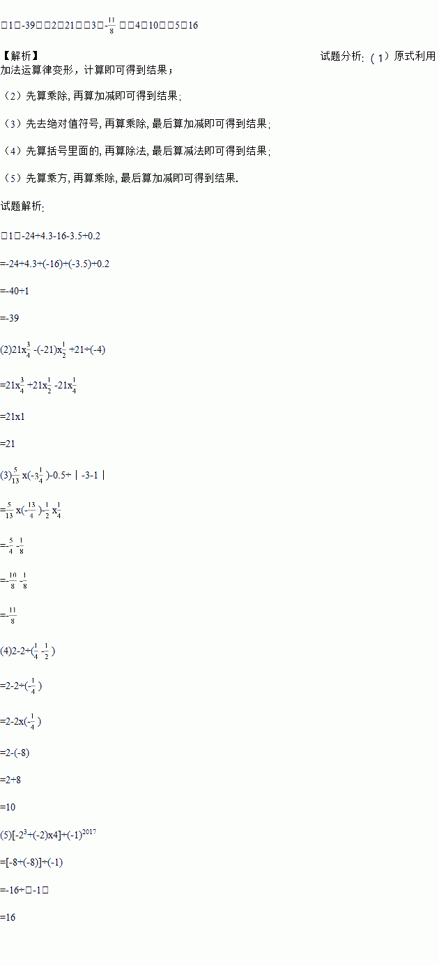 计算:(1)-24+4.3-16-3.5+0.2;(2)21×-(-21) ×+21+(-4);