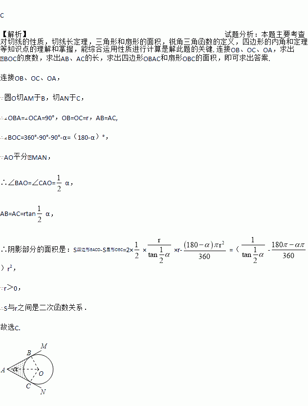如图,⊙O的圆心在定角∠α(0°<α<180°)的角平分线上运动,且⊙O与∠α的两边相切,图中阴影部分的面积S关于⊙O的半径r(r>0)变化的函数图象大致是( )