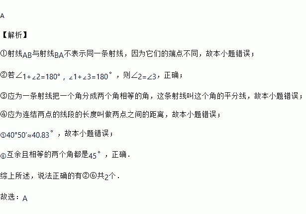 下列说法中:①射线AB与射线BA表示同一条射线.②若∠1+∠2=180°,∠1+∠3=180°,则∠2=∠3.③一条射线把一个角分成两个角,这条射线叫这个角的平分线;④连结两点的线段叫做两点之间的距离.⑤40°50′=40.5°.⑥互余且相等的两个角都是45°,那么,其中正确的是_____(把你认为正确的序号都填上)