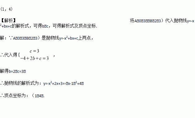 已知A(0,3),B(2,3)是抛物线y=-x2+bx+c上两点,该抛物线的顶点坐标是________.