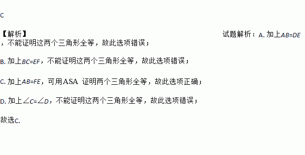 C 【解析】试题解析:A. 加上AB=DE,不能证明这两个三角形全等,故此选项错误; B. 加上BC=EF,不能证明这两个三角形全等,故此选项错误; C. 加上AB=FE,可用证明两个三角形全等,故此选项正确; D. 加上∠C=∠D,不能证明这两个三角形全等,故此选项错误; 故选C.