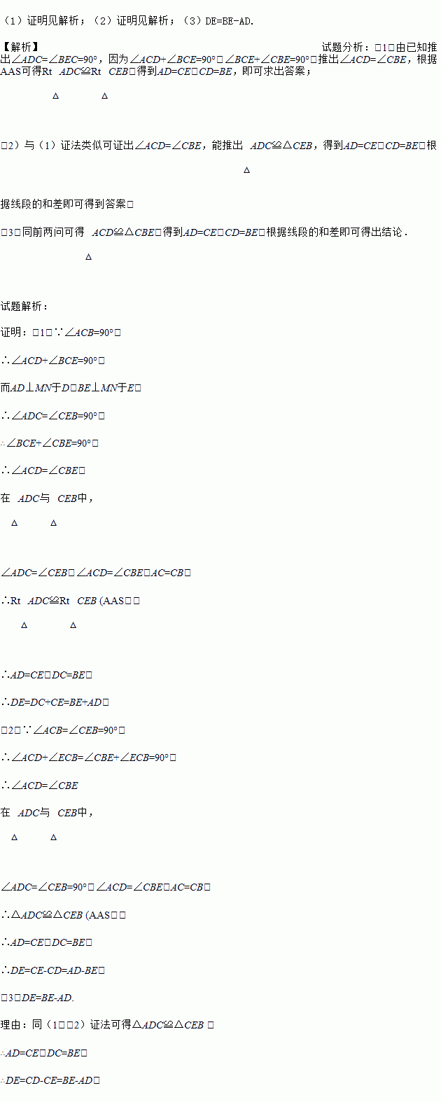 (3)当直线MN绕点C旋转到图3的位置时,试问DE、AD、BE具有怎样的等量关系?请直接写出这个等量关系.