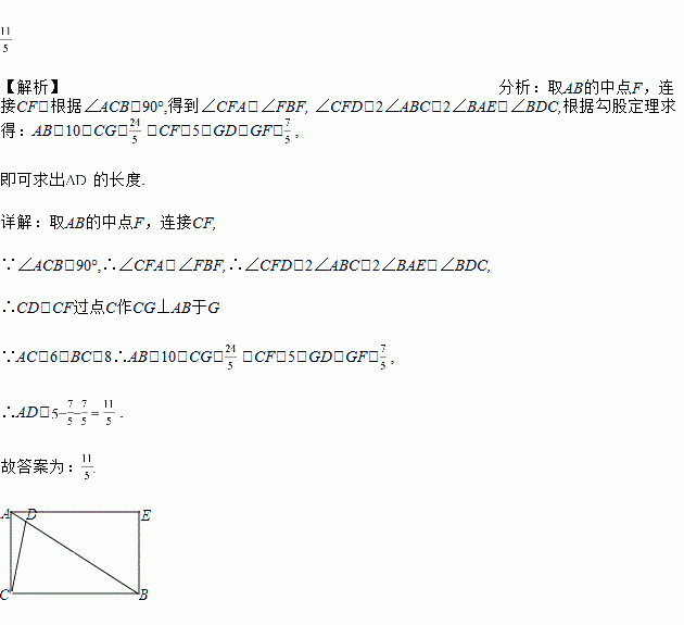 如图,在矩形ABCD中,AC=6,BC=8,D是BA上的一动点,当AD=____________时,∠BDC=2∠BAE.
