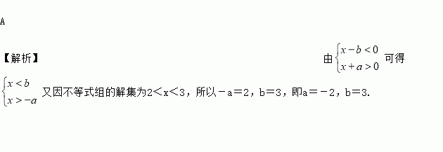 若不等式组的解集为2<x<3,则a、b的值分别为 ( )