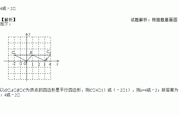 (2016浙江省衢州市)已知直角坐标系内有四个点O(0,0),A(3,0),B(1,1),C(x,1),若以O,A,B,C为顶点的四边形是平行四边形,则x=____________.