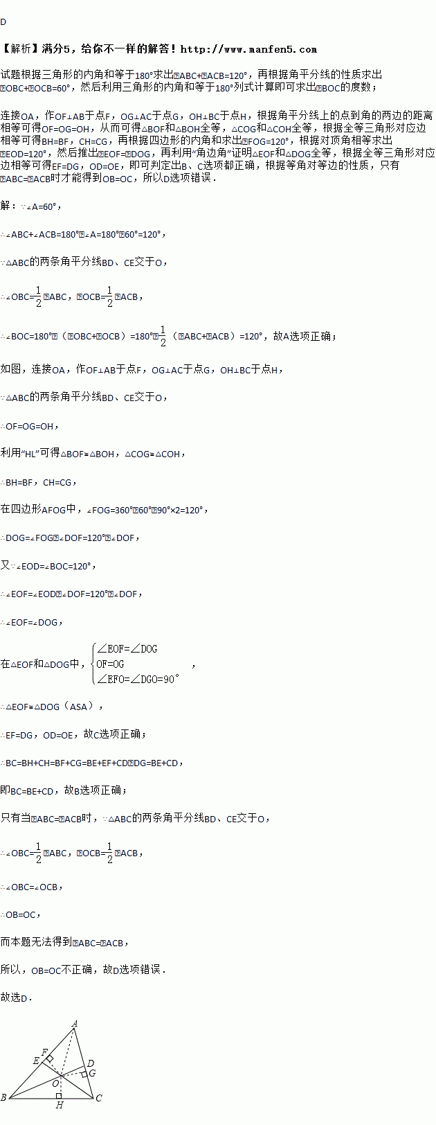 如图,的两条角平分线BD、CE交于O,且,则下列结论中不正确的是( )