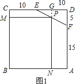 如图,边长为20的正方形ABCD截去一角成为五边形ABCEF,其中DE=10,DF=5,若点P在线段EF上使矩形PMBN有最大面积时,则PE的长度为________.