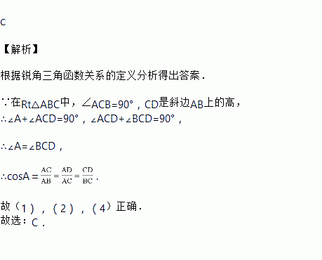如图,在Rt△ABC中,∠ACB=90°,CD是斜边AB上的高,下列线段的比值等于cosA的值的有( )个