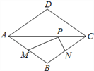 如图,菱形ABCD的两条对角线分别长6和8,点P是对角线AC上的一个动点,点M、N分别是边AB、BC的中点,则PM+PN的最小值是________.