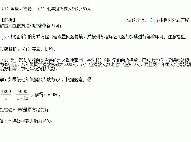(1)主要步骤有:①审清题意;②设未知数;③根据题意找 关系,列出分式方程;④解方程,并 ;⑤写出答案.