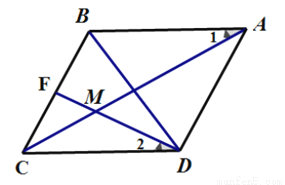 如图,四边形ABCD中,AB∥CD,过点D作DF⊥BC,垂足为F,DF与AC交于点M,已知∠1=∠2.