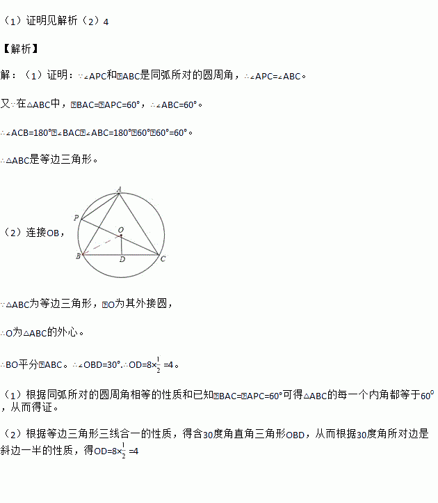 如图,A,P,B,C是半径为8的⊙O上的四点,且满足∠BAC=∠APC=60°,