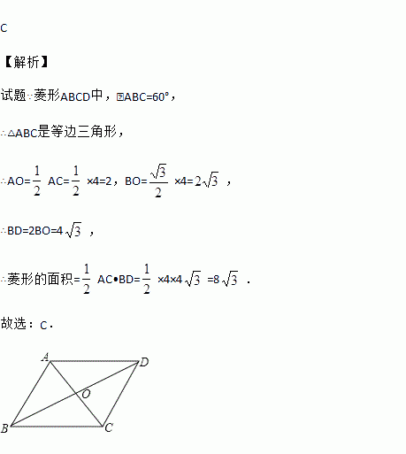 如图,已知菱形ABCD中,对角线AC与BD交于点O,∠BAD=120°,AC=4,则该菱形的面积是( )