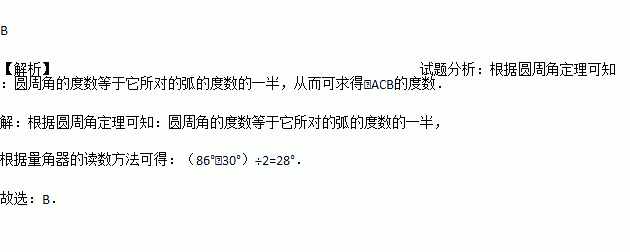 将量角器按如图所示的方式放置在三角形纸板上,使点C在半圆上,点A、B的读数分别为86°、30°,则∠ACB的大小为( )