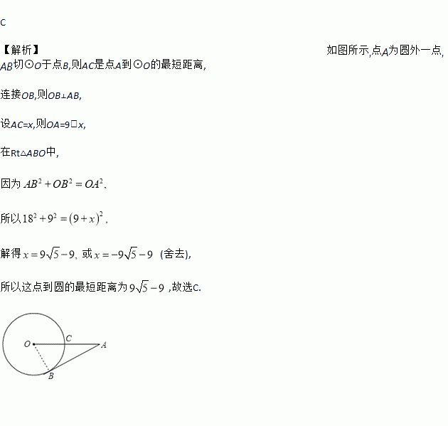 从圆外一点向半径为9的圆作切线,已知切线长为18,从这点到圆的最短距离为( )