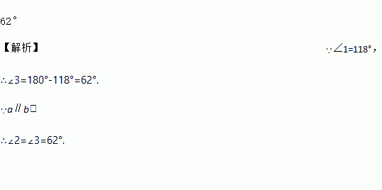 如图,直线a、b被直线c所截,且a∥b。若∠1=118°,则∠2的度数为_______.