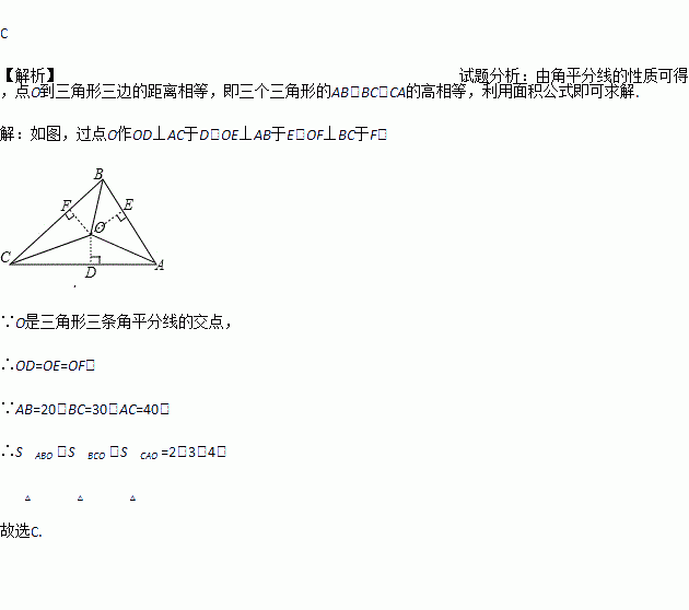 如图,△ABC的三边AB,BC,CA的长分别为20,30,40,O是△ABC三条角平分线的交点,则S△ABO∶S△BCO∶S△CAO等于( )