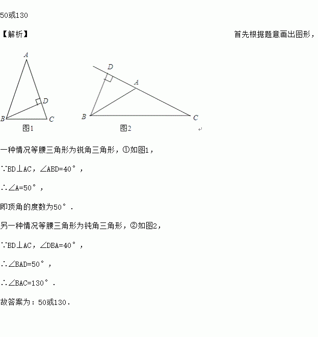 50或130 【解析】首先根据题意画出图形, 一种情况等腰三角形为锐角三角形,①如图1, ∵BD⊥AC,∠ABD=40°, ∴∠A=50°, 即顶角的度数为50°. 另一种情况等腰三角形为钝角三角形,②如图2, ∵BD⊥AC,∠DBA=40°, ∴∠BAD=50°, ∴∠BAC=130°. 故答案为:50或130.