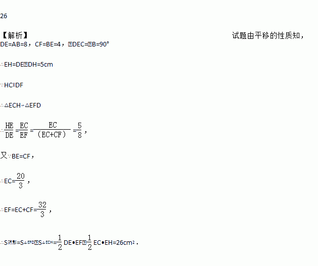 如图所示是重叠的两个直角三角形.将其中一个直角三角形沿BC方向平移得到△DEF.如果AB=8cm,BE=4cm,DH=3cm,则图中阴影部分面积为 cm2.