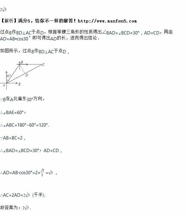 在北偏东方向(距)千米处,在的正东方向(距)千米处,则和之间的距离为________千米.