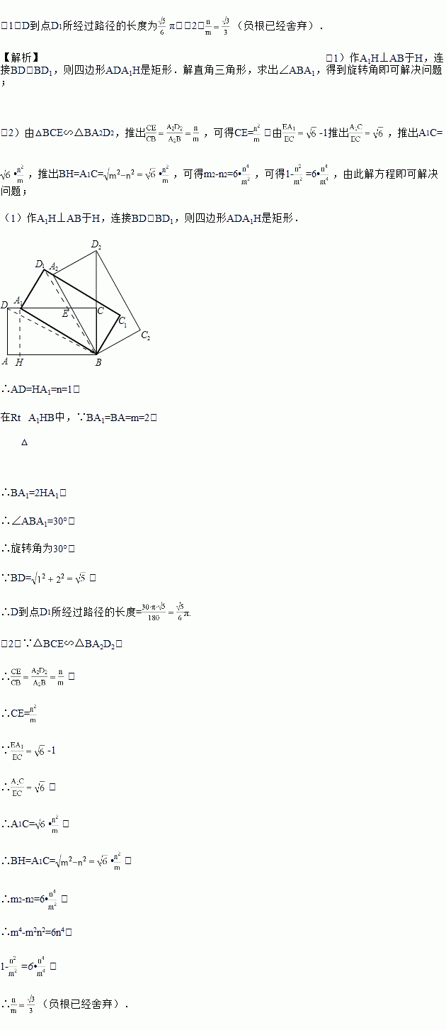(1)若m=2,n=1,求在旋转过程中,点D到点D1所经过路径的长度;