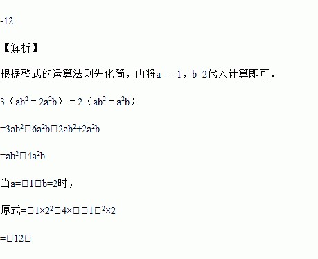 先化简,再求值:3(ab2﹣2a2b)﹣2(ab2﹣a2b),其中a=﹣1,b=2.