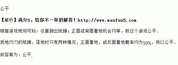 小明用一张扑克牌设计了一个游戏:任意掷出纸牌,如果正面着地,则小明胜;如果背面着地,则小明输.你认为这个游戏________(“公平”或“不公平”).
