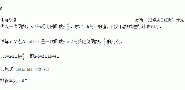 点A(a,b)是一次函数y=x﹣2与反比例函数y= 的交点,则a2b﹣ab2=________.