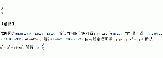 如图,在Rt△ABC中,∠ABC=90°,AB=3,AC=5,点E在BC边上,将△ABC沿AE折叠,使点B落在AC边上的点B′处,则BE的长为________.