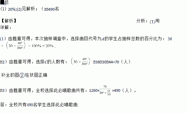 (3)若该校共有1260名学生,根据抽样调查的结果估计全校共有多少学生选择喜欢人数最多的歌曲?(要有解答过程)