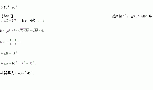 在Rt△ABC中,∠C=90°,若c=6,a=6,则b=___,∠B=_____,∠A=____.