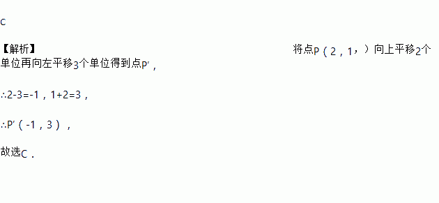 C 【解析】将点P(2,1,)向上平移2个单位再向左平移3个单位得到点P′, ∴2-3=-1,1+2=3, ∴P′(-1,3), 故选C.