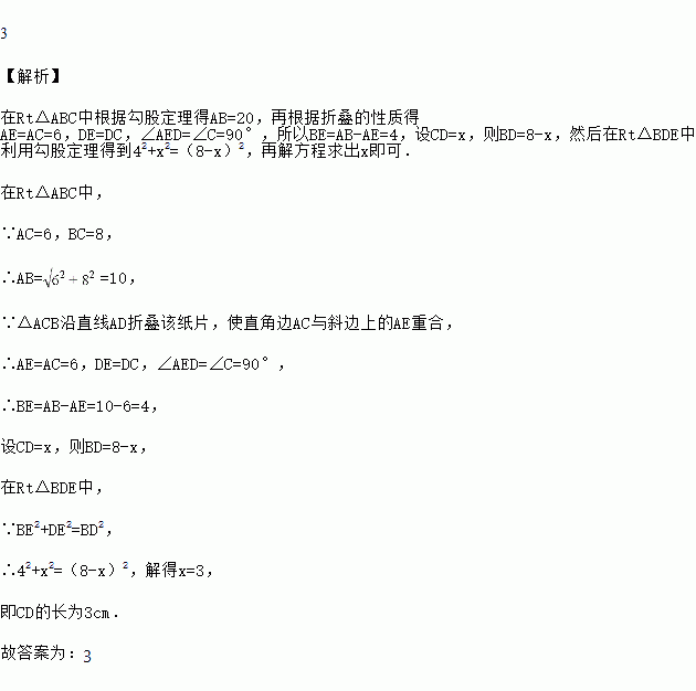 如图,一张纸片的形状为直角三角形,其中,,,沿直线AD折叠该纸片,使直角边AC与斜边上的AE重合,则CD的长为______cm.