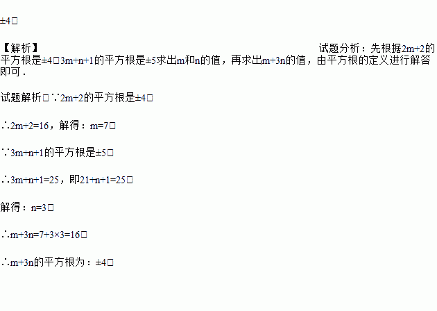 已知2m+2的平方根是±4,3m+n+1的平方根是±5,求m+3n的平方根.