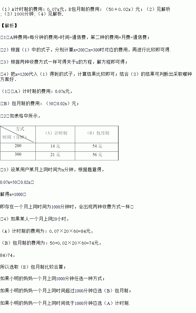 (4)如果某人一个月上网20小时,那么应选用哪一种方式较为合算?如果小明的妈妈准备办理这种业务,你能告诉她如何选择更加合算吗?