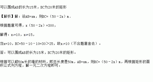 如图,某中学准备在校园里利用围墙的一段,再砌三面墙,围成一个矩形花园ABCD(围墙MN最长可利用25m),现在已备足可以砌50m长的墙的材料,试设计一种砌法,使矩形花园的面积为300m2.