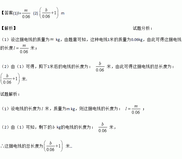 【答案(1)l= (2) m 【解析】试题分析: (1)设这捆电线的质量为kg,由题意可知,这种电线1米的质量为0.06kg,由此可得这捆电线的长度米; (2)由(1)可得,剪下1米后的电线的长度为: 米,由此可得这捆电线的总长度为: 米. 试题解析: (1)设电线的长度为米,质量为m kg,则这捆电线的长度为: ; (2)由(1)可知,剩下的kg的电线的长度为...