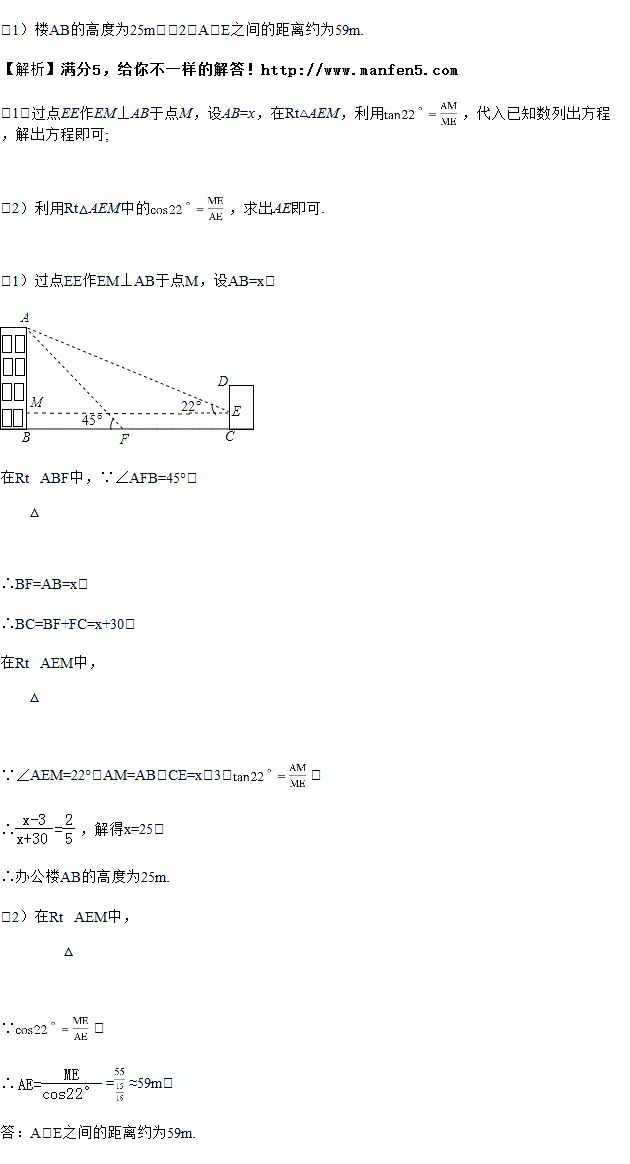 如图,宿豫区某校教学楼AB的后面有一建筑物CD,当光线与地面的夹角是22°时,教学楼在建筑物的墙上留下高3米的影子CE,而当光线与地面夹角是45°时,教学楼顶A在地面上的影子F与墙角C有30米的距离(B、F、C在一条直线上).