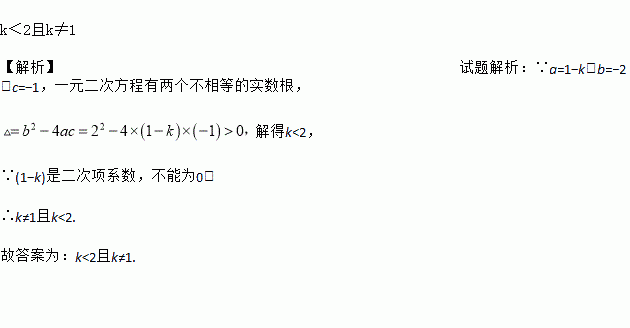 k<2且k≠1 【解析】试题解析:∵a=1?k,b=?2,c=?1,一元二次方程有两个不相等的实数根, 解得k<2, ∵(1?k)是二次项系数,不能为0, ∴k≠1且k<2. 故答案为:k<2且k≠1.