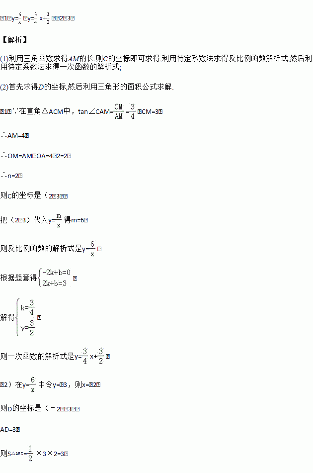 (m≠0)的阳象交于点c(n,3),与x轴、y轴分别交于点A、B,过点C作CM⊥x轴,垂足为M,若tan∠CAM=