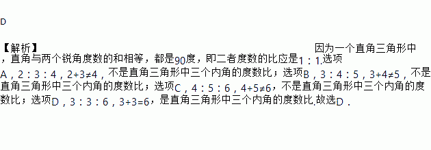 D 【解析】因为一个直角三角形中,直角与两个锐角度数的和相等,都是90度,即二者度数的比应是1:1.选项A,2:3:4,2+3≠4,不是直角三角形中三个内角的度数比;选项B,3:4:5,3+4≠5,不是直角三角形中三个内角的度数比;选项C,4:5:6,4+5≠6,不是直角三角形中三个内角的度数比;选项D,3:3:6,3+3=6,是直角三角形中三个内角的度数比.故选D.